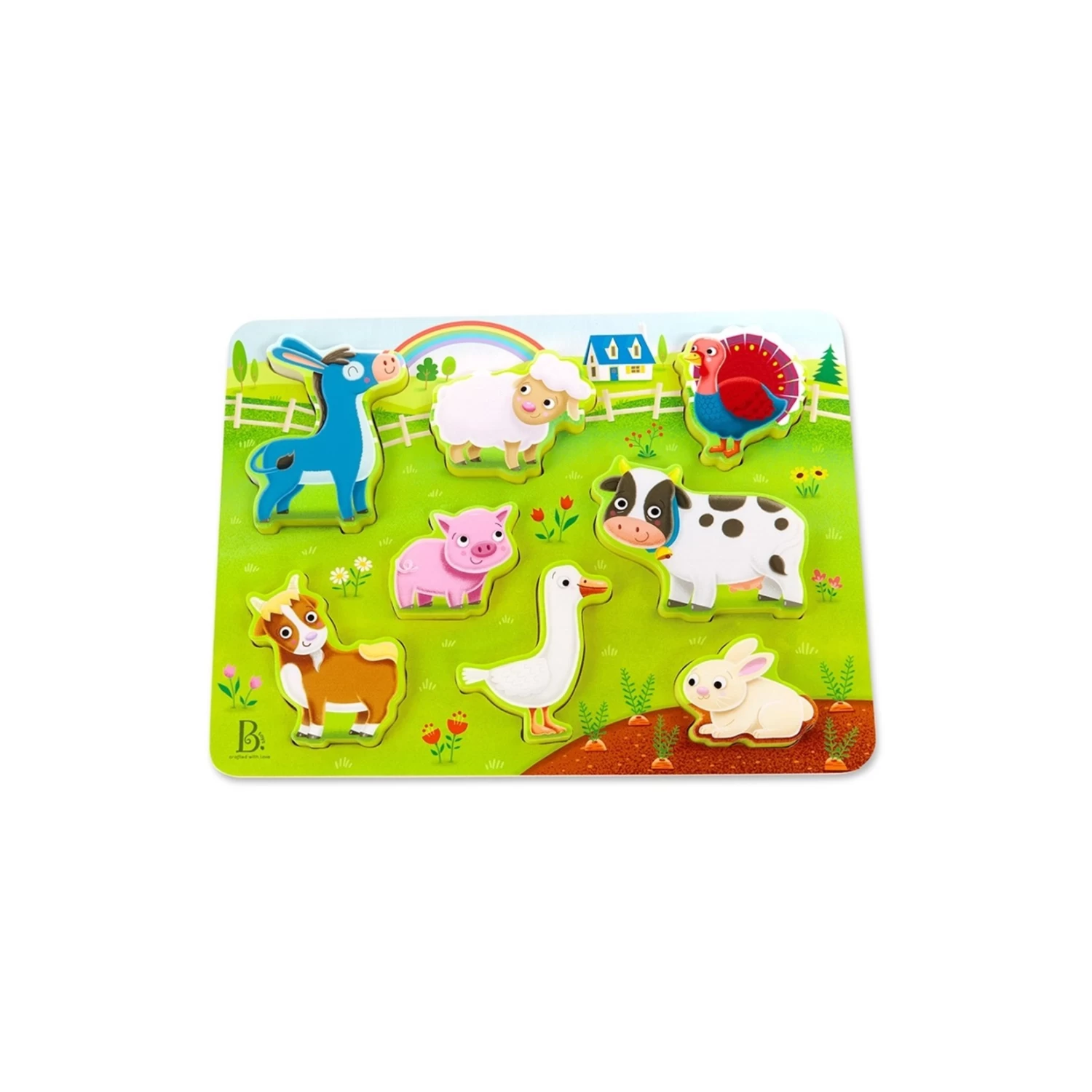 Casse-tête en bois sur le thème des animaux de la ferme »Peek & Explore ». Apprends à reconnaître différents animaux de la ferme en tentant de placer chacun d’eux sur la planche.