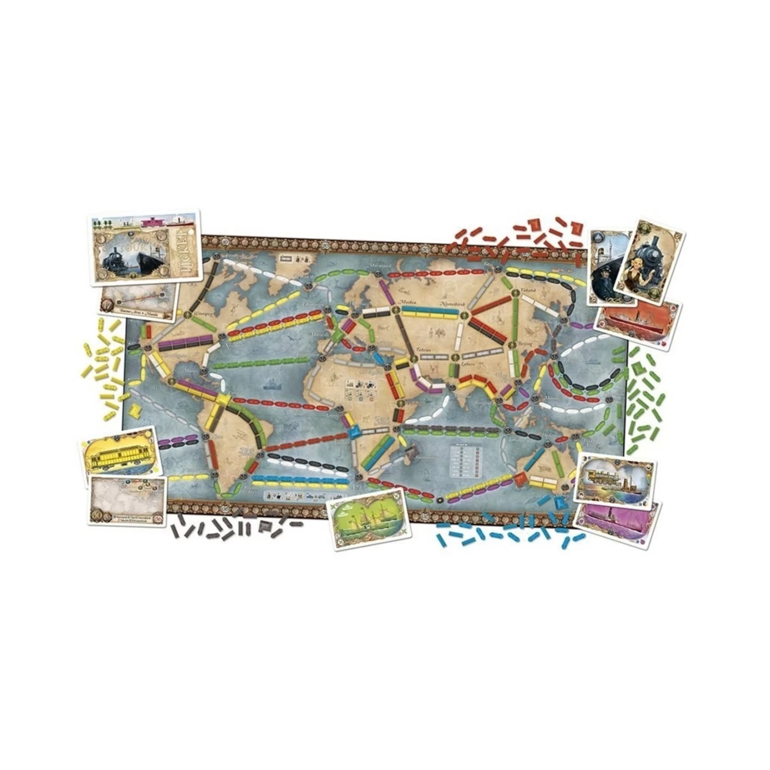 Avec Les Aventuriers du Rail Autour du monde, il n’existe plus de barrières dans vos déplacements. Par voie ferrée ou par bateau, découvrez le monde entier grâce aux deux plateaux magistralement conçus et illustrés. Les vétérans et les novices trouveront leur compte avec ce nouveau membre de la famille de Les Aventuriers du Rail.