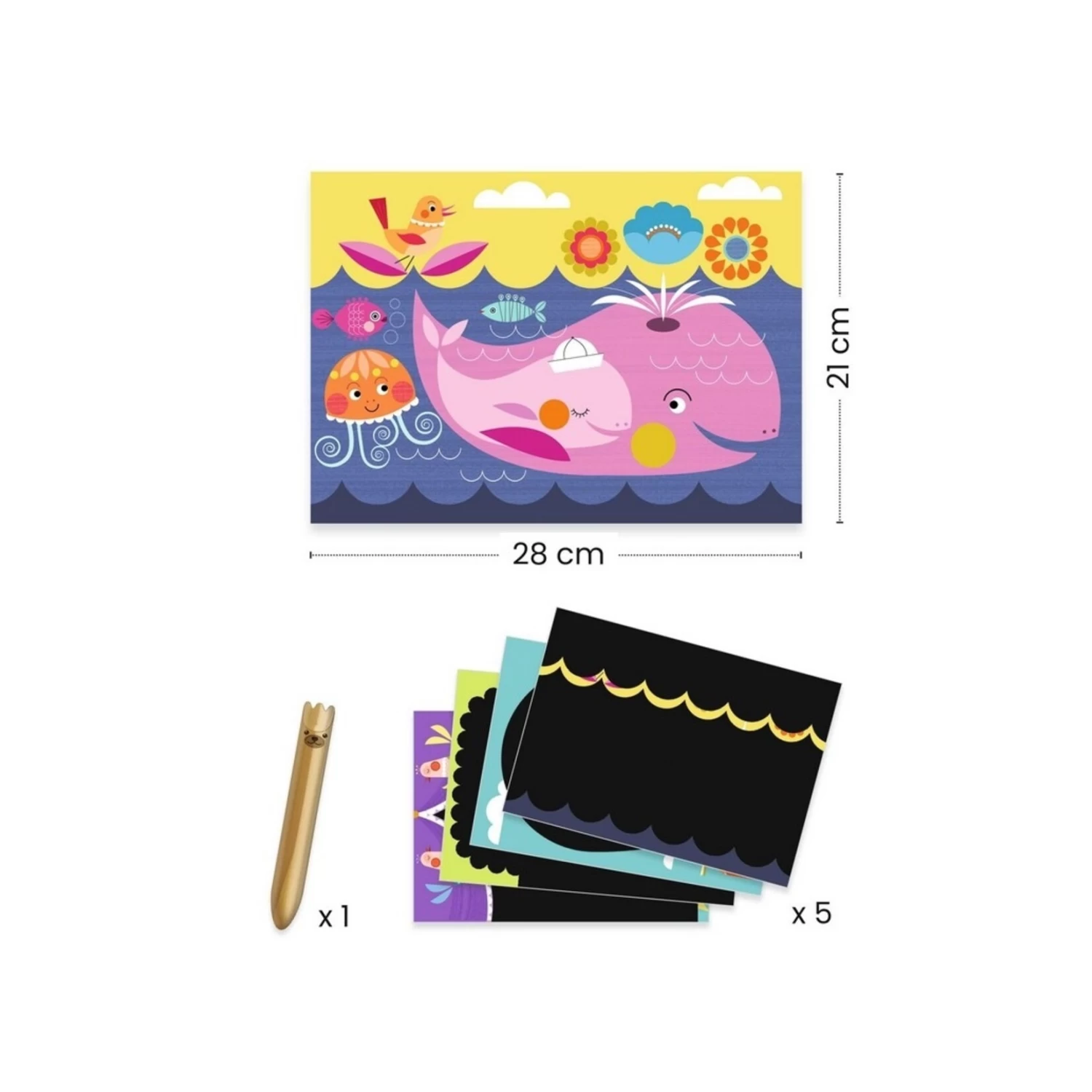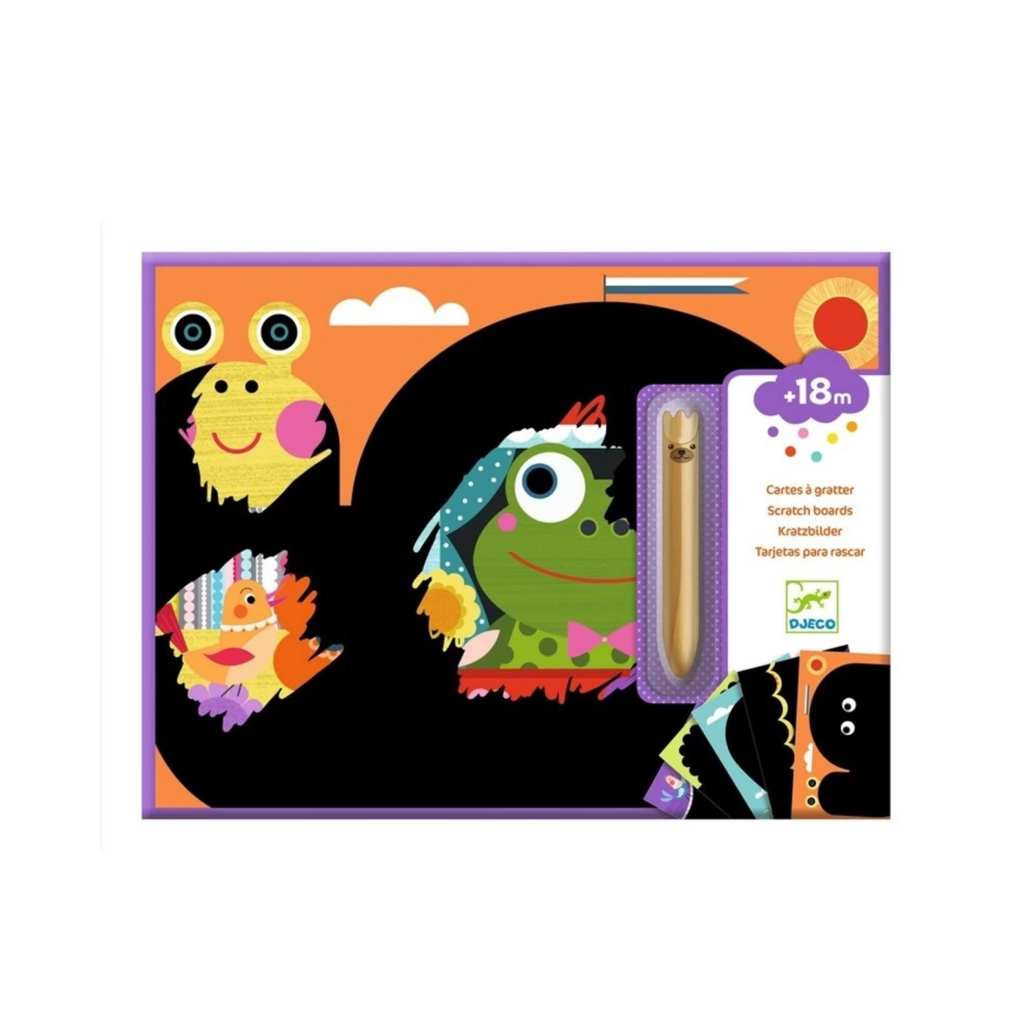 Pour les petits, il faut de la surface. Alors voici 5 grands tableaux à gratter, avec un gros bâtonnet en bois adapté pour les plus jeunes enfants, dès 18 mois. À l’aide du bâtonnet, l’enfant gratte la surface de la carte pour faire des traces et découvrir des surprises, quel plaisir ! Et même si, emporté dans son élan, il a envie de tout gratter, le résultat sera joli aussi.