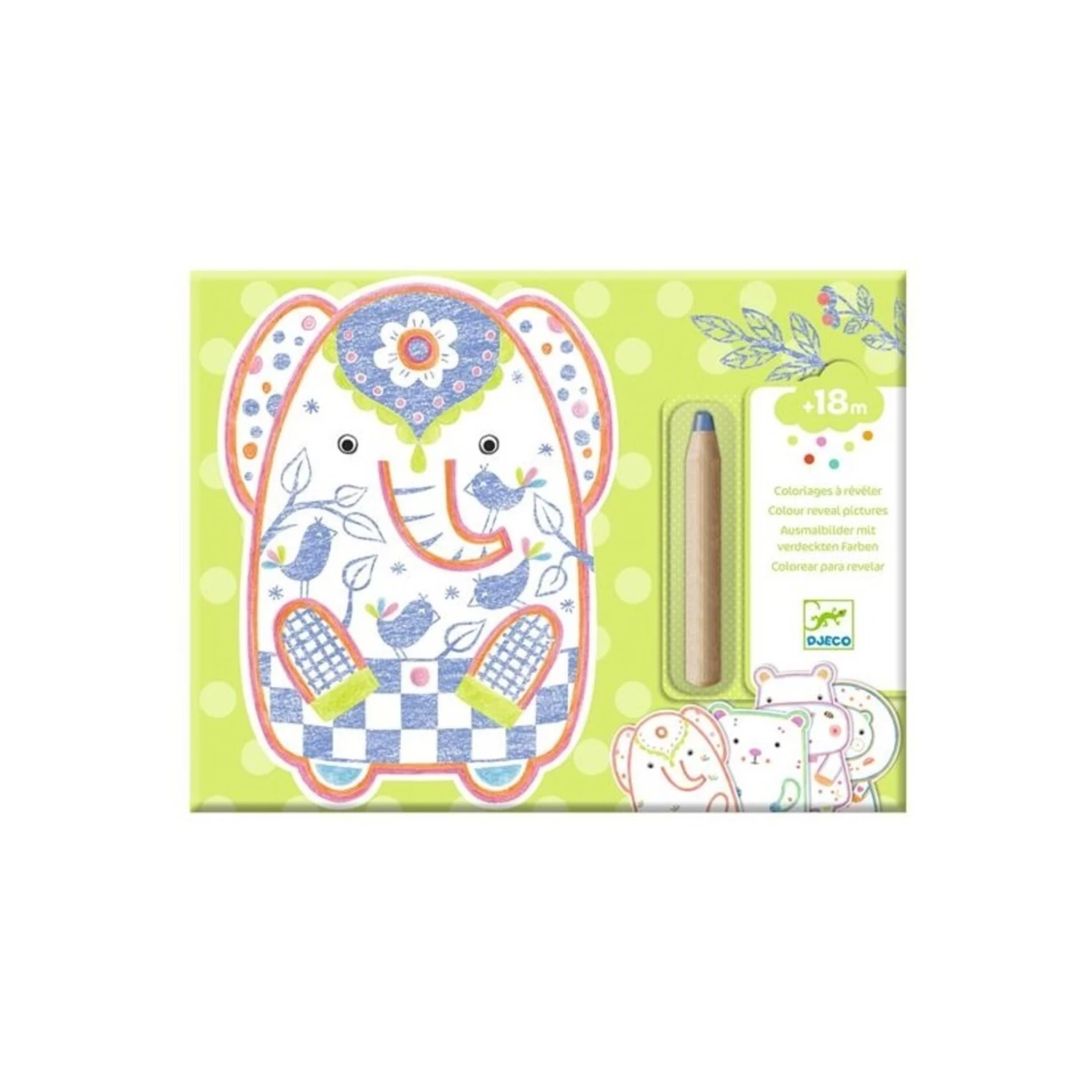 Une pochette de 12 images à colorier avec un gros crayon de couleur, adapté pour les petits enfants. L’enfant colorie les animaux sauvages à l’aide du crayon pour découvrir ce qui se cache. C’est magique : le crayon ne marque que sur certaines zones, des motifs apparaissent et révèlent des surprises !