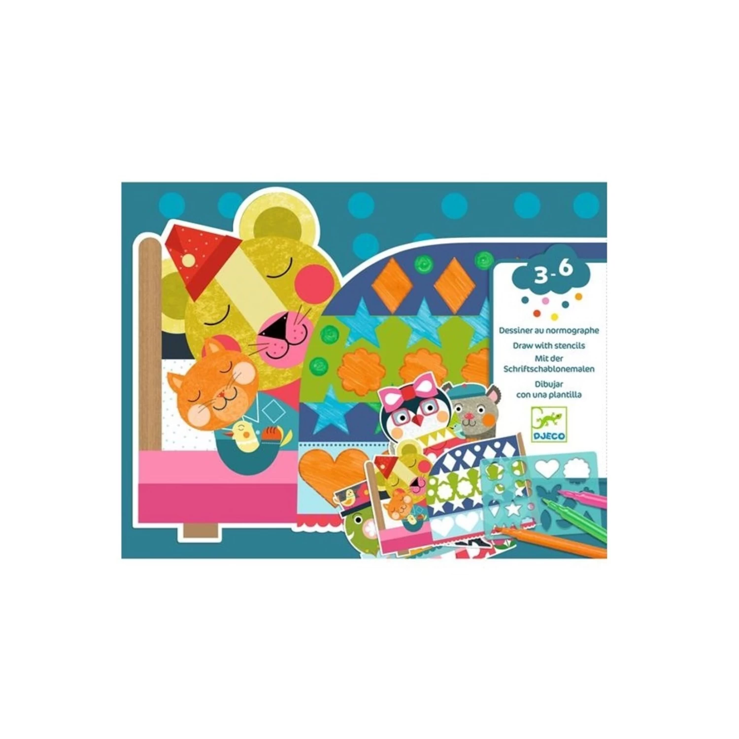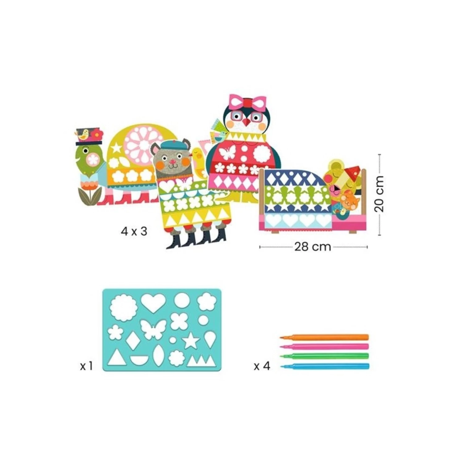 Un coffret de coloriage pour décorer les animaux à l’aide de la réglette à formes. L’enfant choisit un animal, puis il place la réglette de façon à ce que la forme du trou de la réglette coïncide avec celle sur le papier. Il colorie ensuite dans le trou pour remplir parfaitement la forme. Une fois toutes les formes coloriées, il découvre un bel animal tout coloré.