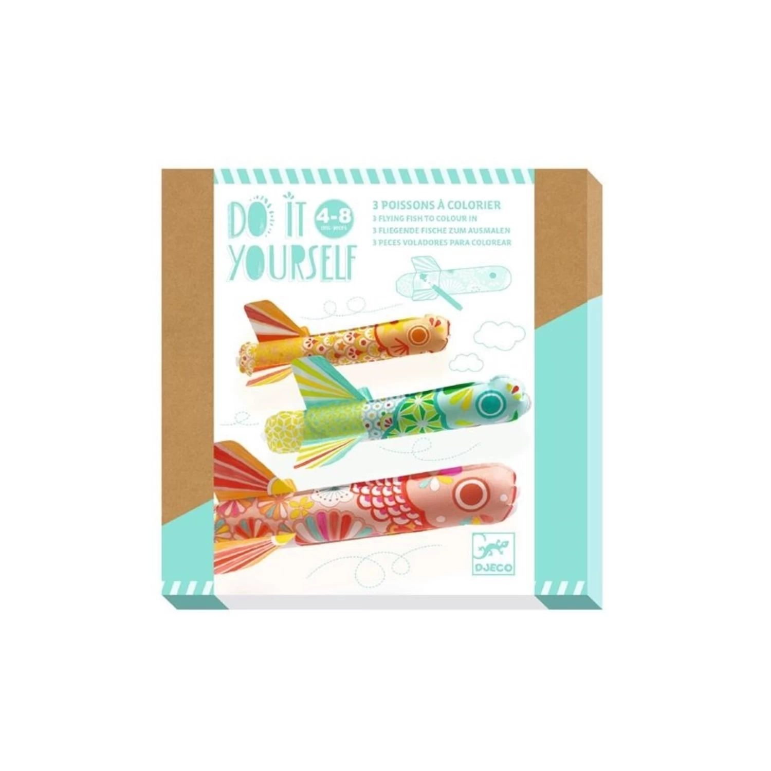 Un kit créatif avec 3 poissons volants gonflables à colorier. Les poissons se colorient simplement avec des feutres, se gonflent avec les pailles fournies, et volent dans les airs !
