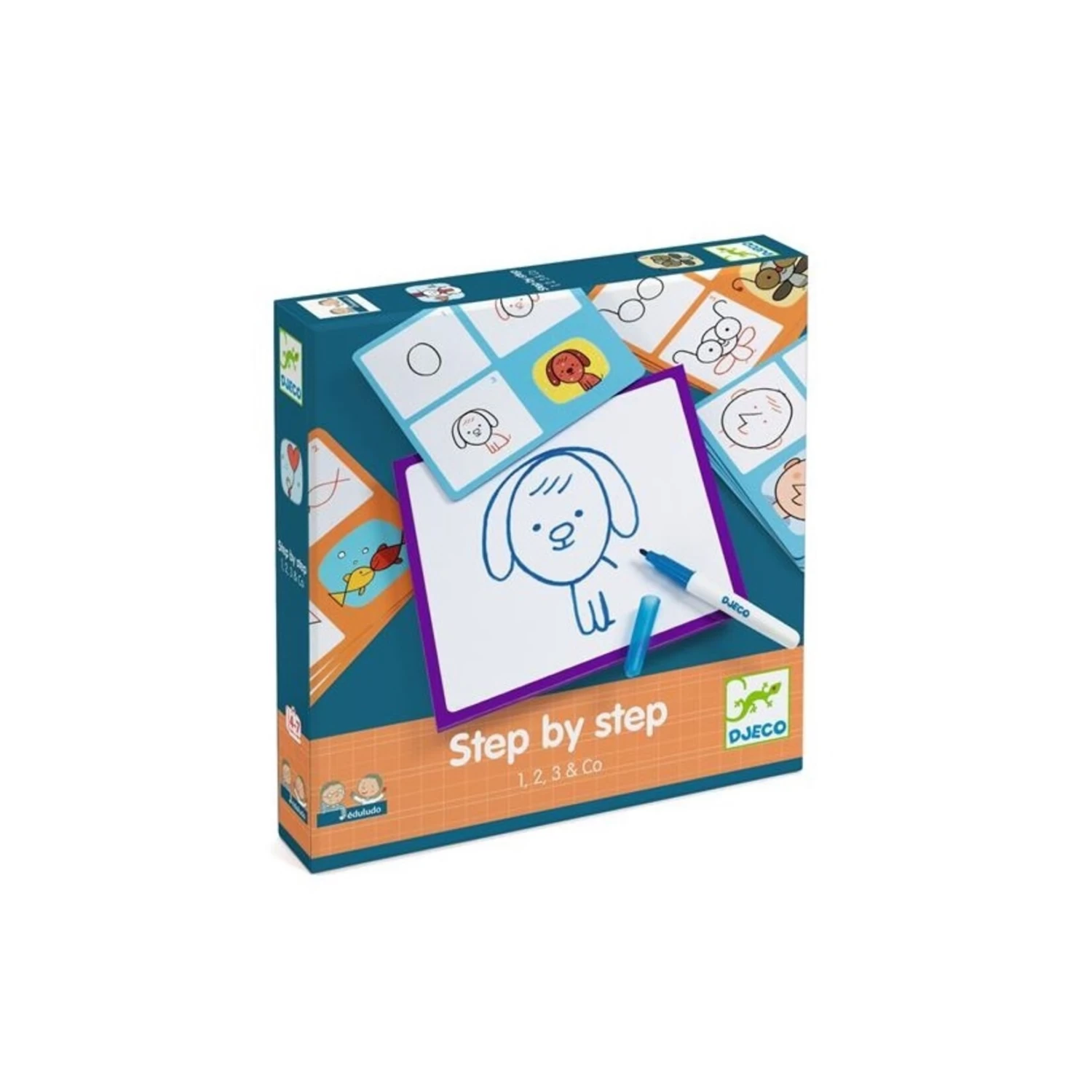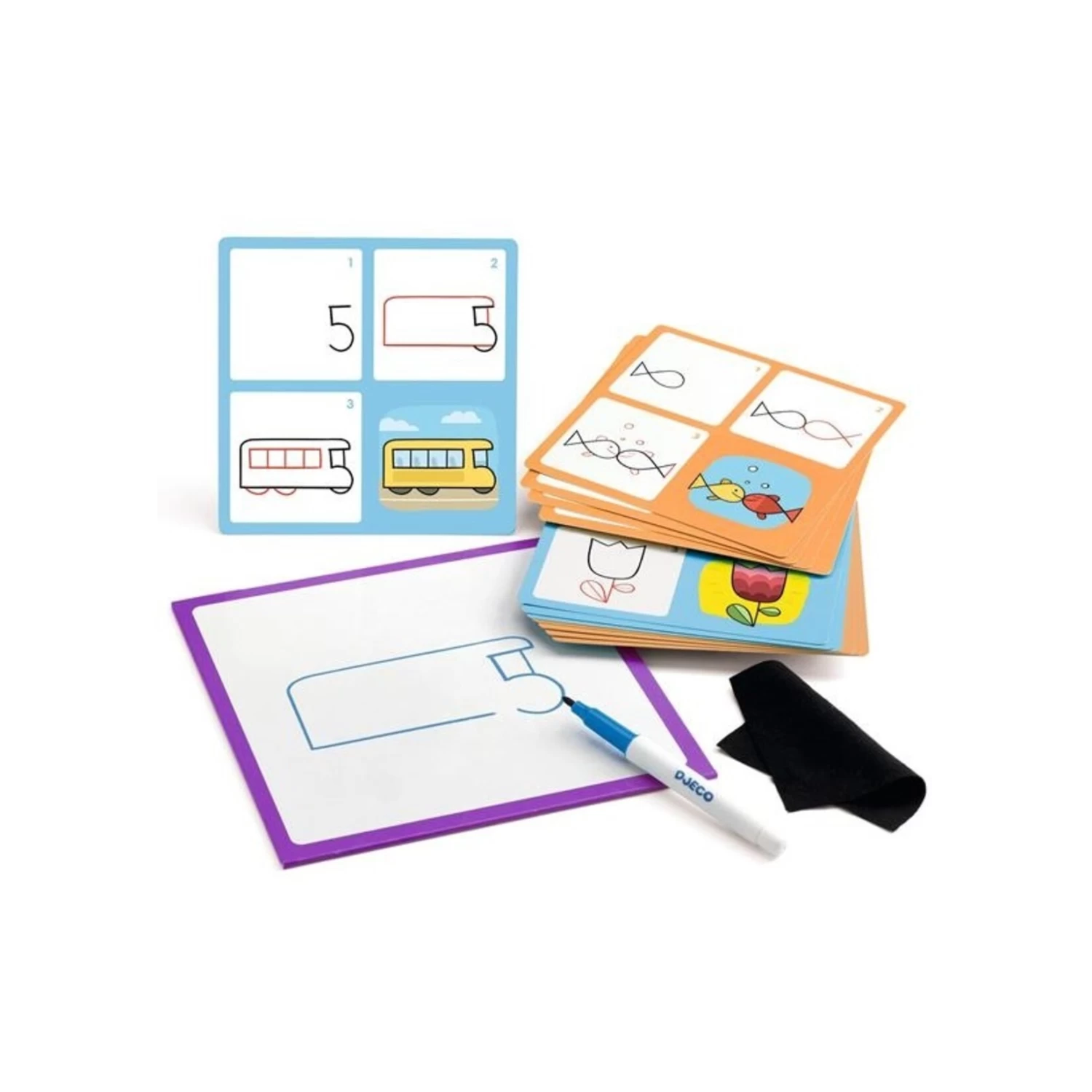 Apprendre à dessiner en suivant le pas-à-pas. Des cartes « modèle » pour guider l’enfant. Il recommence autant de fois qu’il le souhaite avec le feutre effaçable. Une première approche ludique et facile de la symétrie axiale.