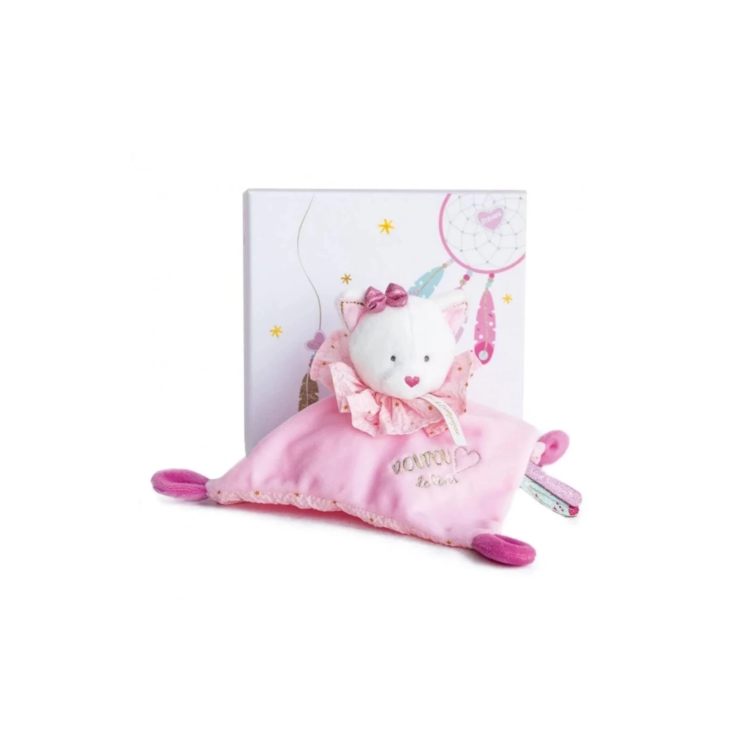 Un doudou Attrape rêve avec une tête de chat que bébé peut facilement saisir et qui saura réconforter et accompagner votre enfant. Avec son nœud pailleté et sa douceur c’est le doudou idéal.