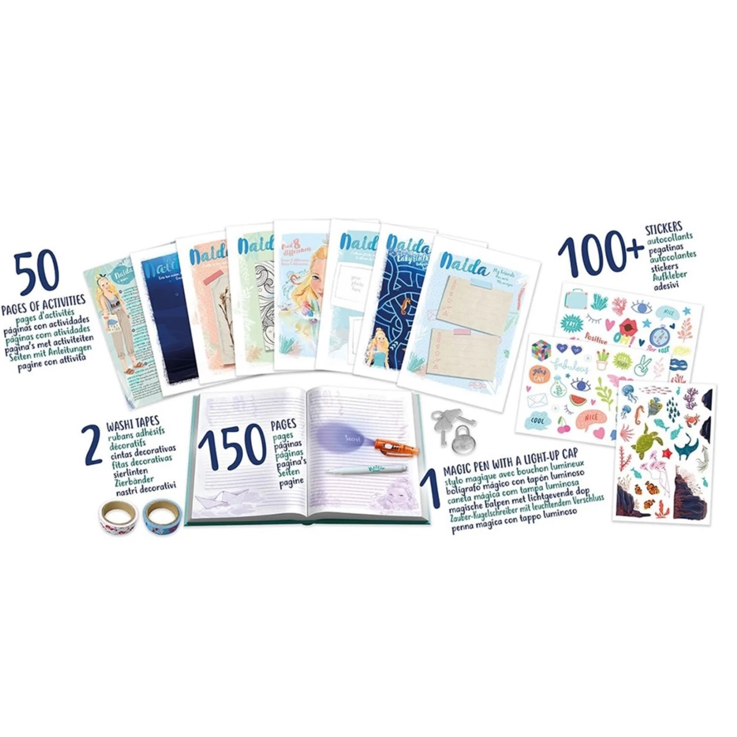 Comprend : 150 pages d’écriture et d’activités, 3 planches d’autocollants, 2 rouleaux de washi tape, stylo magique avec bouchon lumineux.