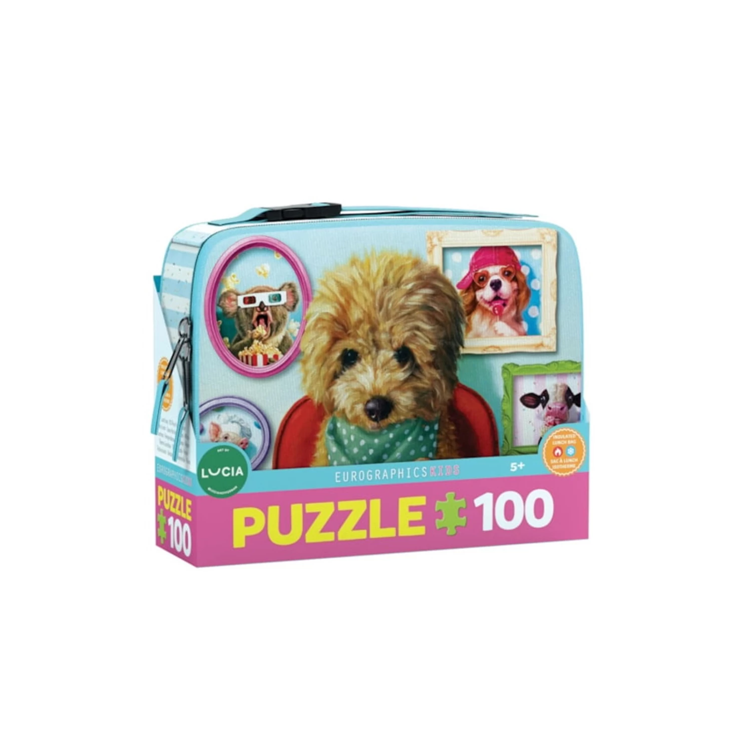 Puzzle rangé dans un sac à lunch isolé. Affiche incluse d’une image de puzzle.
