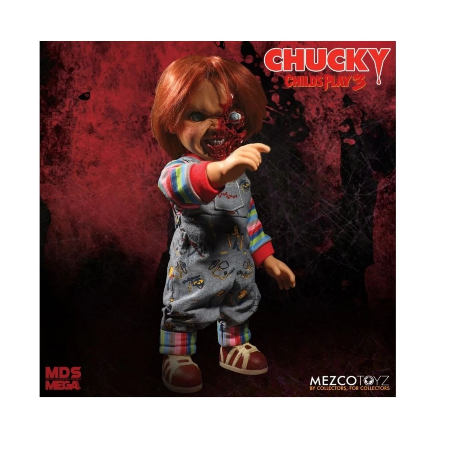 Tout comme il l’a fait dans les films, Chucky a beaucoup à dire de « Salut, je suis Chucky et je suis ton ami jusqu’à la fin! » à des phrases bien plus sinistres. Arborant sa combinaison « Good Guys » et sa chemise rayée, Chucky présente 11 points d’articulation, ses cheveux orange et ses yeux de verre réalistes.