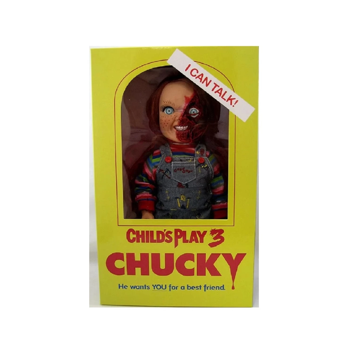 En raison d’un accident à l’usine des Play Pals, Chucky a reçu un nouveau souffle et une nouvelle opportunité de prendre en charge une âme sans méfiance. The Child’s Play 3: Talking Pizza Face Chucky propose une toute nouvelle sculpture de tête, représentant le visage mutilé de Chucky après une course avec la faux de Grim Reaper dans le « Devil’s Lair ».