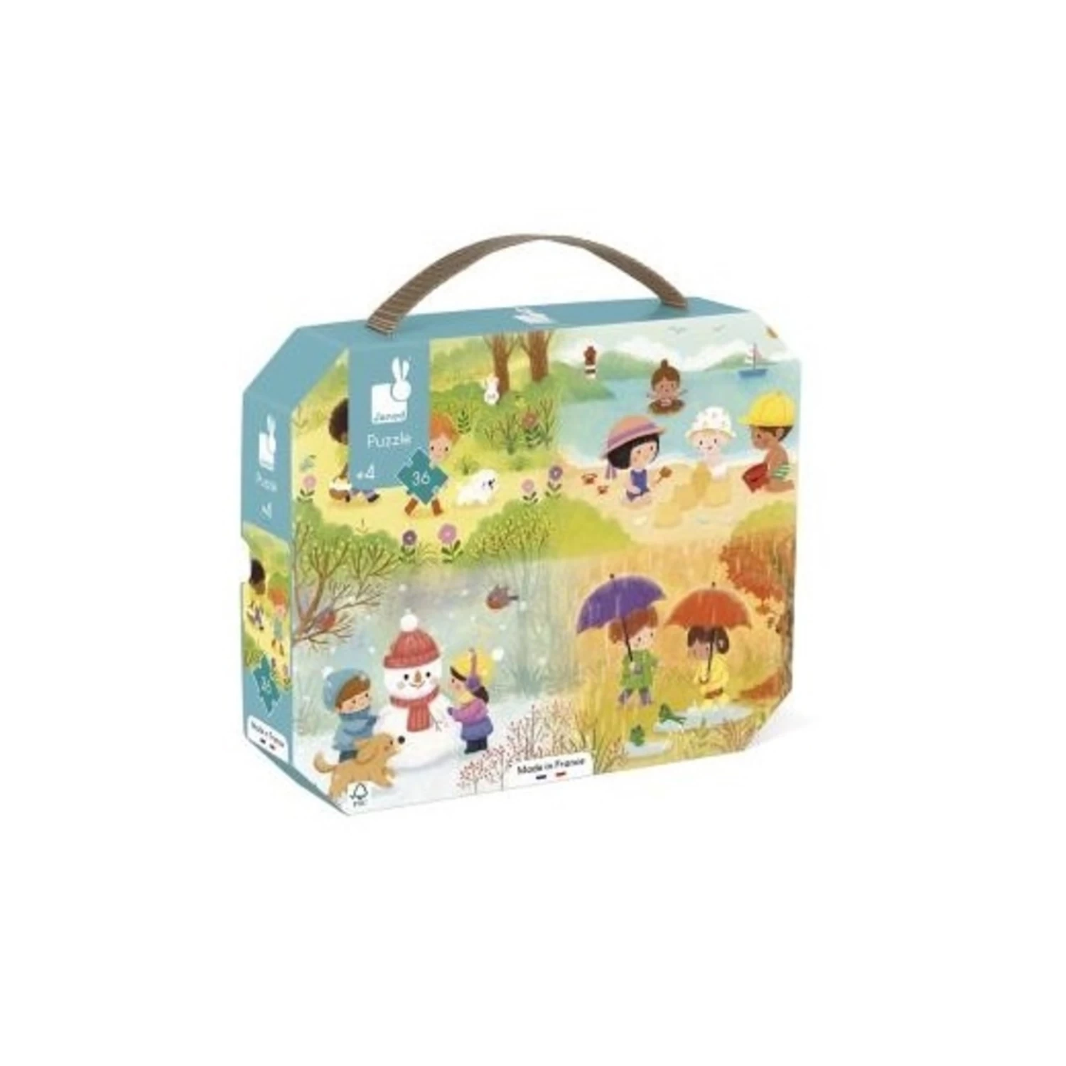 Printemps, été, automne, hiver ! Partez à la découverte des 4 saisons avec ce magnifique puzzle en carton de 36 pièces aux nombreux détails. Votre enfant développera mémoire et dextérité, avec ce beau puzzle en carton de 36 pièces. Dans sa jolie valisette, ce puzzle sera facile à transporter grâce à sa poignée en tissu. Contient un poster servant de modèle pour les débutants, les plus aguerris pourront ensuite réaliser le puzzle en toute autonomie. Fabriqué en France, produit FSC TM et à base d’encres végétales.