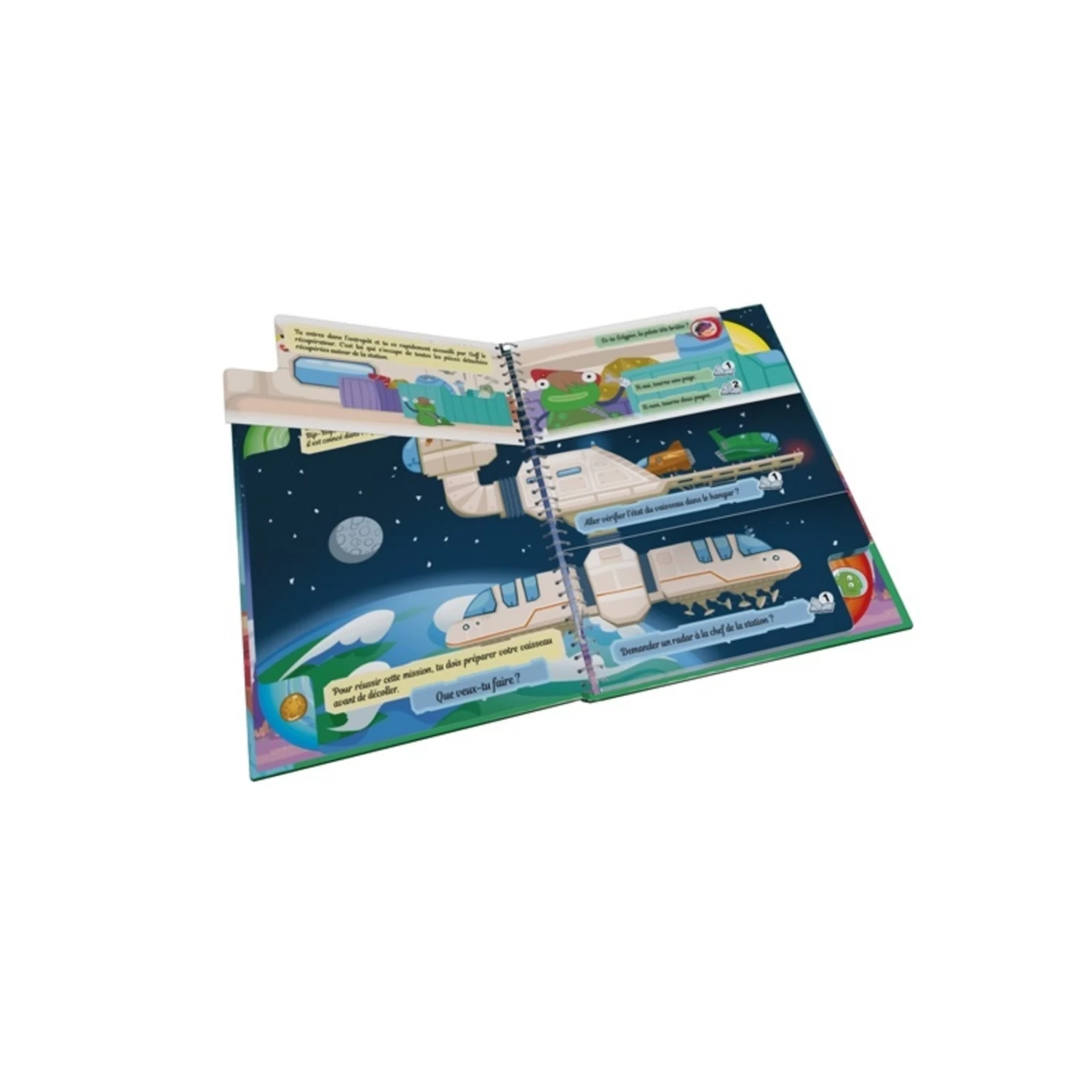 Crée ta propre histoire : à chaque page coupée en trois, tu devras faire un choix. Vos choix modèlent votre aventure, pour le meilleur ou pour le pire! Au cours de chaque histoire, chaque lecture sera donc une nouvelle aventure ! Aujourd’hui, tu vas accomplir une grande mission spaciale! Tu prends ton vaisseau pour serourir Bip-Bop, ton copain robot!