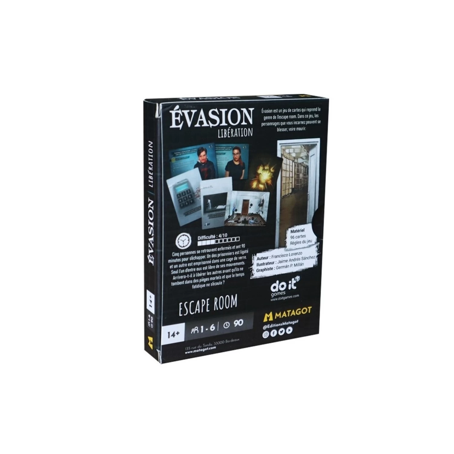 Evasion – Libération est un jeu de carte de type escape game. Cette boite contient 3 scénarios de niveau 4/10.