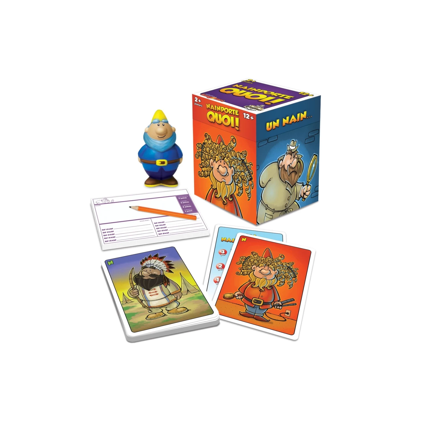 Testez votre esprit de déduction dans ce jeu de devinettes loufoques! Observez bien les illustrations et soyez le premier joueur à vous emparer du nain de caoutchouc pour donner le mot qui débute par un nain… Si personne ne trouve la réponse, vous aurez droit à un naindice. Le joueur ou l’équipe qui termine la partie avec le plus haut pointage gagne!