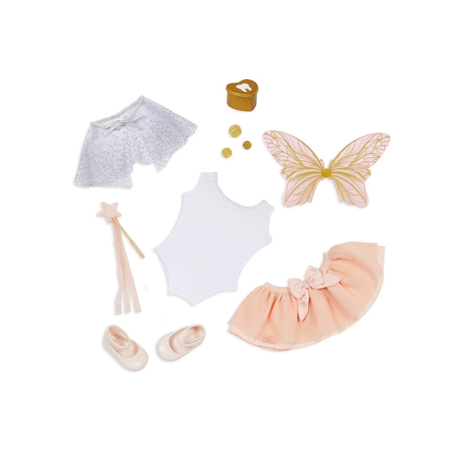 Comprend : 1 cape, 1 léotard, 1 jupe, 1 paire de chaussures, 1 boîte à dents, 1 paire d’ailes, 3 pièces de monnaie et 1 baguette.