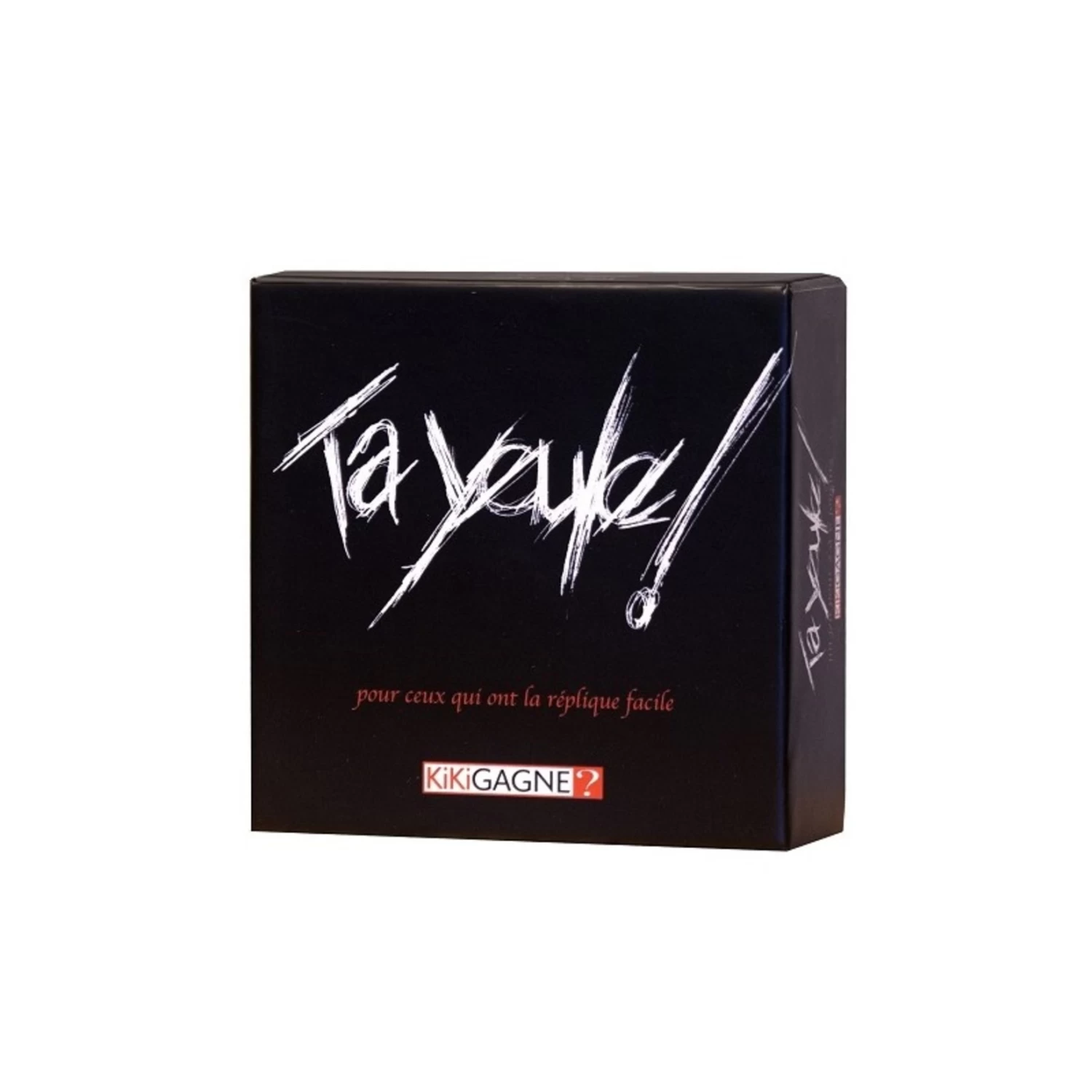 Version québécoise du jeu Taggle ! 100 Réflexions, 200 Répliques, 12 cartes compteurs et la règle. Un jeu qui porte à la discussion ! On te dit : Je crois que je t’aime ! Il faut alors choisir l’une des 4 répliques : T’es vraiment malade ! Ça te dérange si je reprends de la tarte ? Pense à tes enfants. Faut toujours que tu chiales ! Et si on vous disait : On m’a piqué mon portefeuille ! Ta Yeule ! c’est 100 réflexions et 200 répliques créatives. Il faut choisir la réplique qui tue sinon on vous dira : TA YEULE ! Fous rires garantis !