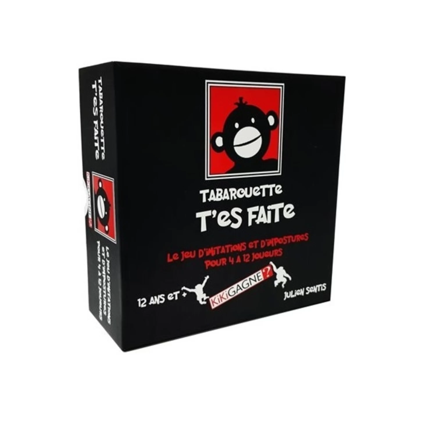 Un jeu d’ambiance débile ou tout le monde reçoit la même carte action….sauf toi ! T’es faite !!! Pendant que les autres casseront des œufs ou se brosseront les dents, tu devras essayer des les imiter sans te faire pogner. Tabarouette T’es Faite est un jeu de mime en groupe ou touts les joueurs doivent mimer la même chose en même temps, sauf un seul joueur qui ne sait pas ce qu’il faut mimer et qui doit tout faire pour ne pas se faire remarquer en se fondant dans les mimes du groupe.