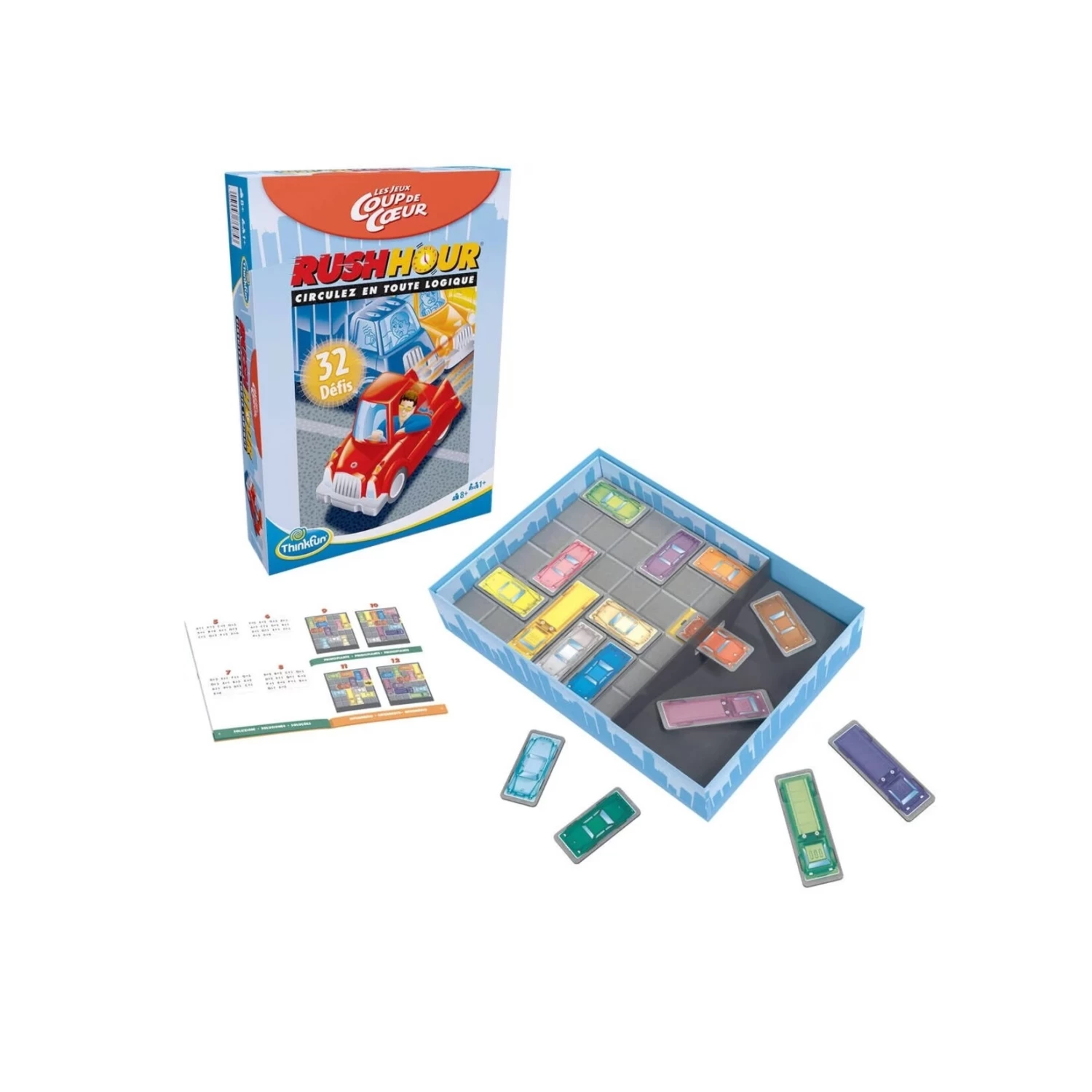 Rush Hour® enfin en version compacte ! Découvrez 32 défis inédits et 4 niveaux de difficulté jouables directement dans la boîte ! Rush Hour® est le leader des jeux de blocs à déplacer, conçu pour les débutants comme pour les experts. Faites glisser la voiture rouge vers le bord du plateau de jeu pour la sortir des embouteillages. Pour cela, choisissez une carte Défi et placez les véhicules sur le plateau de la manière indiquée sur l’illustration.